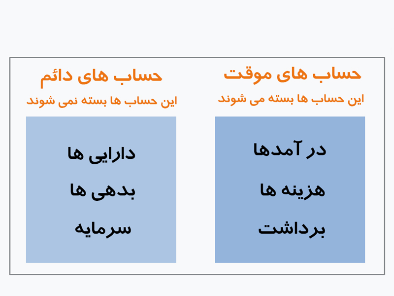 حسابهای موقت در پایان دوره مالی به عنوان یک مبلغ بسته به ماهیت بدهکار یا بستانکار به سرمایه اضافه یا کسر می گردد.